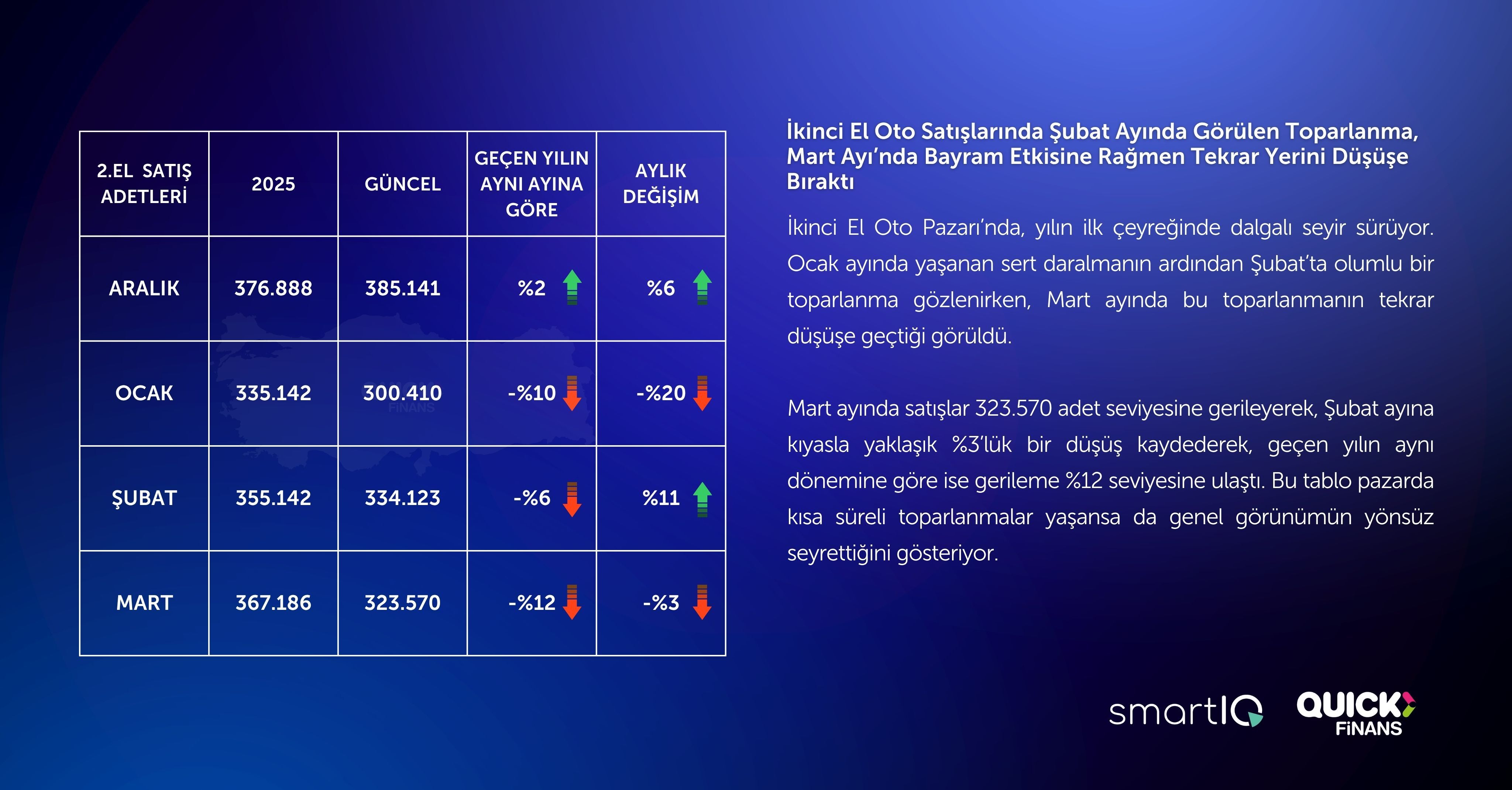 Mart ayında satışlar 323.570 adet seviyesine gerileyerek, Şubat ayına kıyasla yaklaşık %3’lük bir düşüş kaydederek, geçen yılın aynı dönemine göre ise gerileme %12 seviyesine ulaştı. Bu tablo pazarda kısa süreli toparlanmalar yaşansa da genel görünümün yönsüz seyrettiğini gösteriyor.