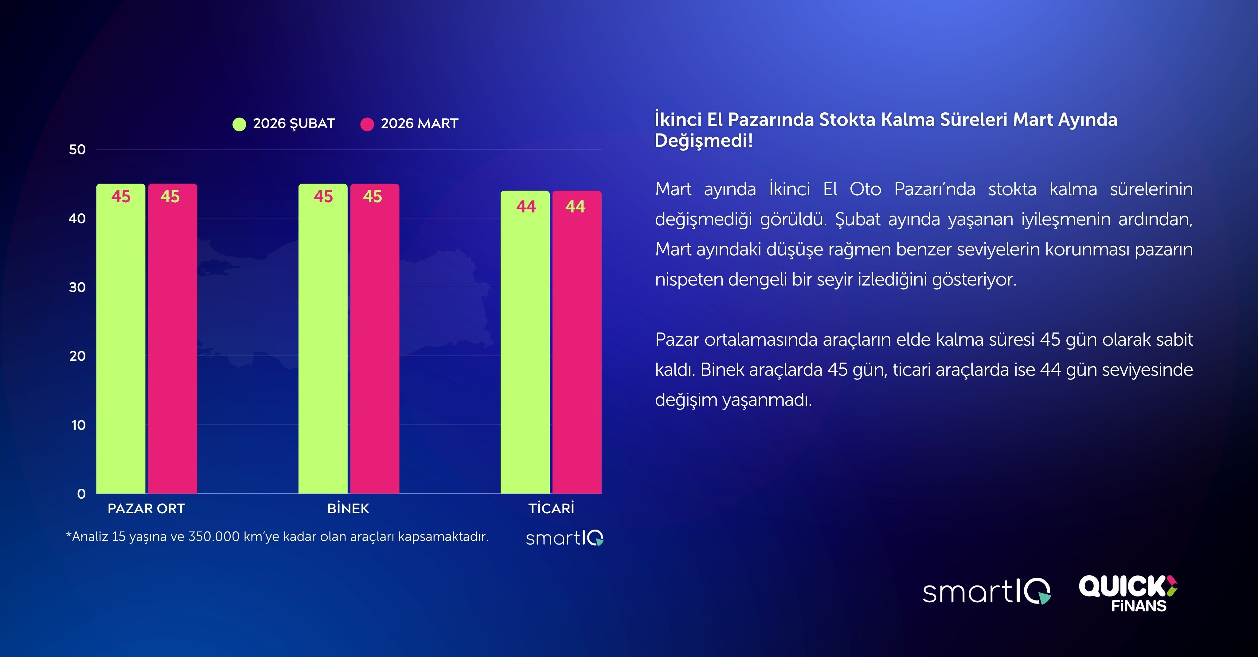 Pazar ortalamasında araçların elde kalma süresi 45 gün olarak sabit kaldı. Binek araçlarda 45 gün, ticari araçlarda ise 44 gün seviyesinde değişim yaşanmadı.