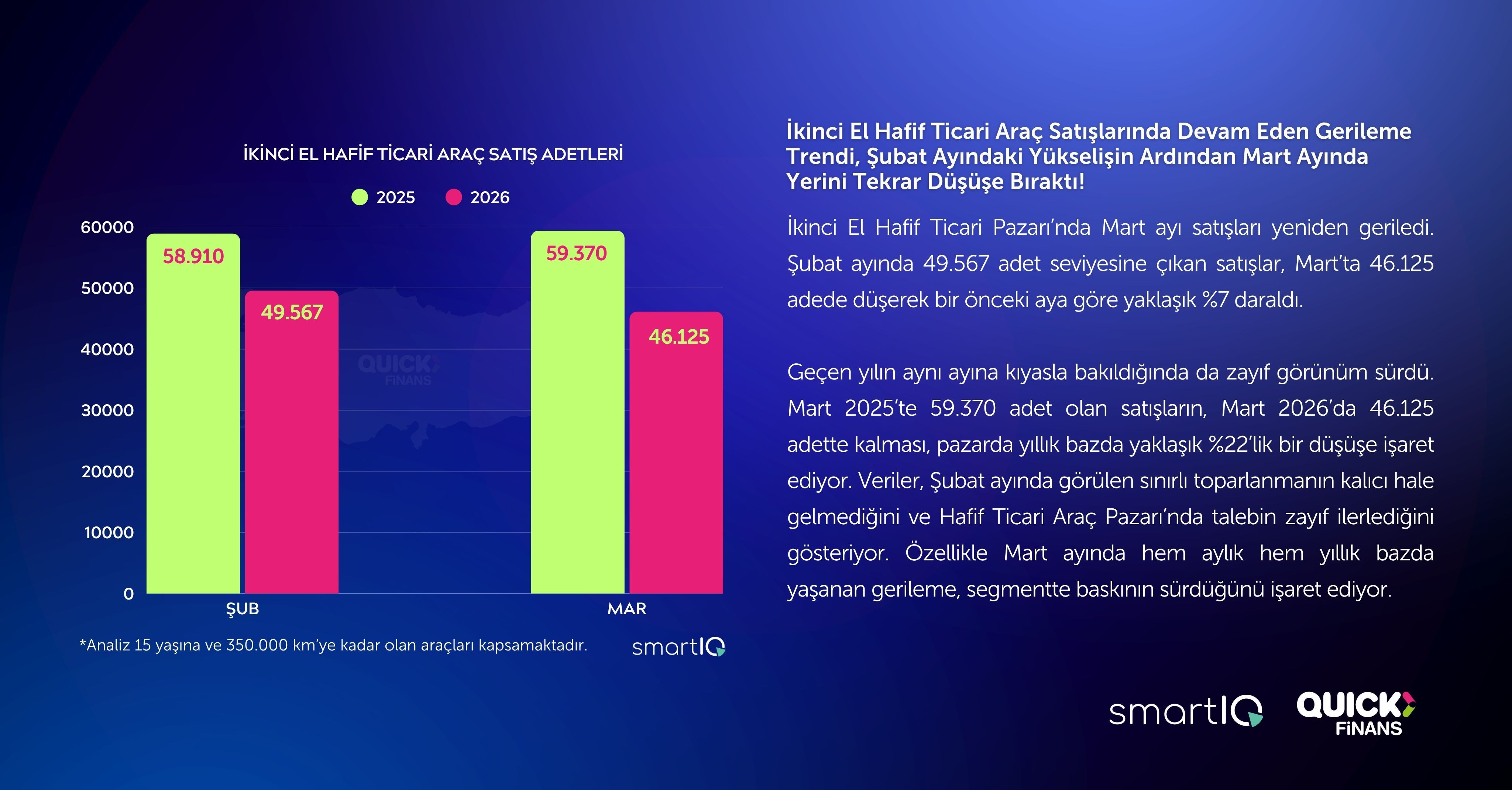 İkinci El Hafif Ticari Pazarı’nda Mart ayı satışları yeniden geriledi. Şubat ayında 49.567 adet seviyesine çıkan satışlar, Mart’ta 46.125 adede düşerek bir önceki aya göre yaklaşık %7 daraldı.