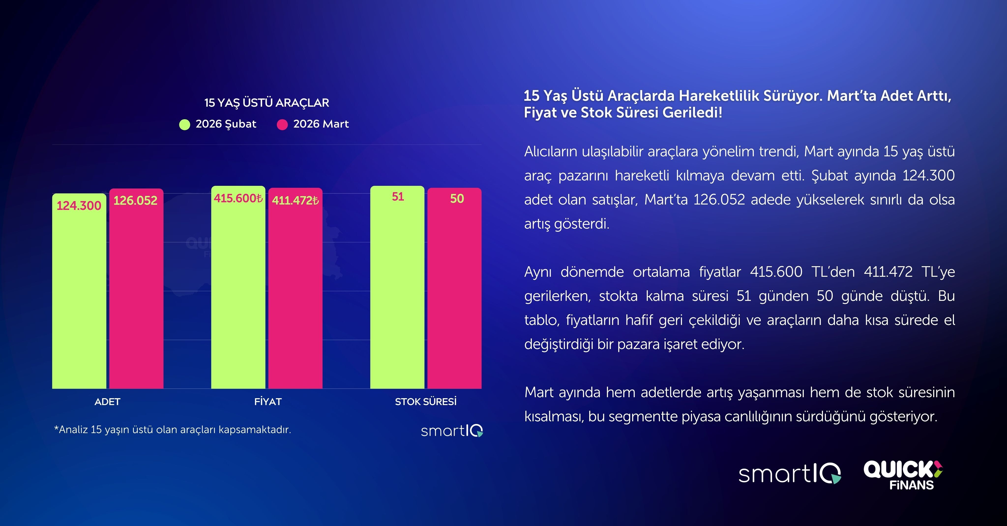 Alıcıların ulaşılabilir araçlara yönelim trendi, Mart ayında 15 yaş üstü araç pazarını hareketli kılmaya devam etti. Şubat ayında 124.300 adet olan satışlar, Mart’ta 126.052 adede yükselerek sınırlı da olsa artış gösterdi.