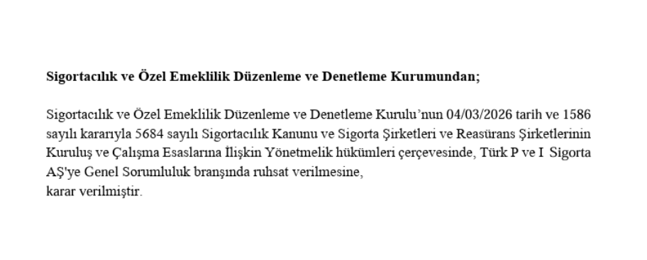 Sigortacılık ve Özel Emeklilik Düzenleme ve Denetleme Kurulu’nun 04/03/2026 tarih ve 1586 sayılı kararıyla 5684 sayılı Sigortacılık Kanunu ve Sigorta Şirketleri ve Reasürans Şirketlerinin Kuruluş ve Çalışma Esaslarına İlişkin Yönetmelik hükümleri çerçevesinde, Türk P ve I Sigorta AŞ'ye Genel Sorumluluk branşında ruhsat verilmesine, karar verilmiştir.