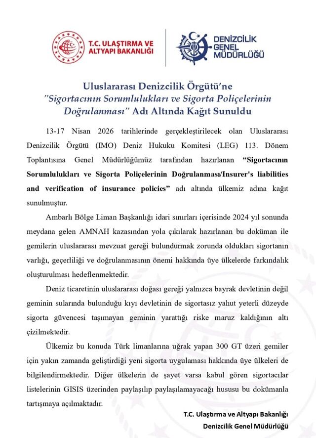 T.C. Ulaştırma ve Altyapı Bakanlığı Denizcilik Genel Müdürlüğü, Uluslararası Denizcilik Örgütü (IMO) nezdinde deniz güvenliğini yakından ilgilendiren önemli bir çalışmaya imza attı. Denizcilik Genel Müdürlüğü tarafından hazırlanan ve IMO Deniz Hukuku Komitesi’nin (LEG) 13-17 Nisan 2026 tarihleri arasında gerçekleştirilecek 113. Dönem Toplantısı’na sunulacak çalışma, “Sigortacının Sorumlulukları ve Sigorta Poliçelerinin Doğrulanması” başlığını taşıyor.